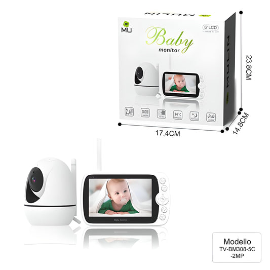 Baby Monitor Wireless No Wifi Video e Audio, Schermo LCD 5’’, 1080p Alta Risoluzione, Funzione VOX, Visione Notturna, Monitoraggio della Temperatura, 6 Ninna Nanne, Rotazione 350° (TV-BM308-5C-2MP)